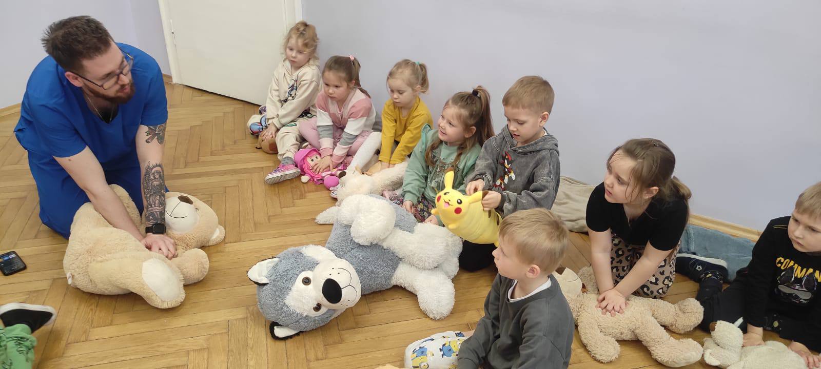 Pan Bartek pokazał dzieciom w jaki sposób możemy udzielić pierwszej pomocy i jak sprawdzić czy poszkodowana osoba oddycha.