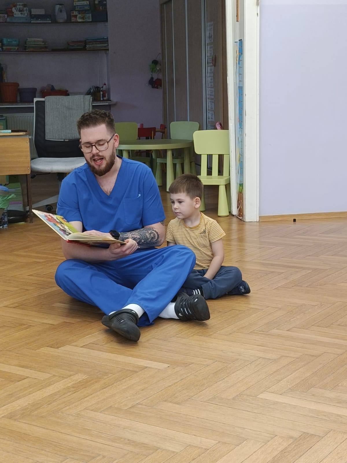Pan Bartek Lazarek przeczytał naszym dzieciom bajkę pt. "Łukasz ratuje Misia" oraz przybliżył i wytłumaczył na czym polega praca pielęgniarza.
